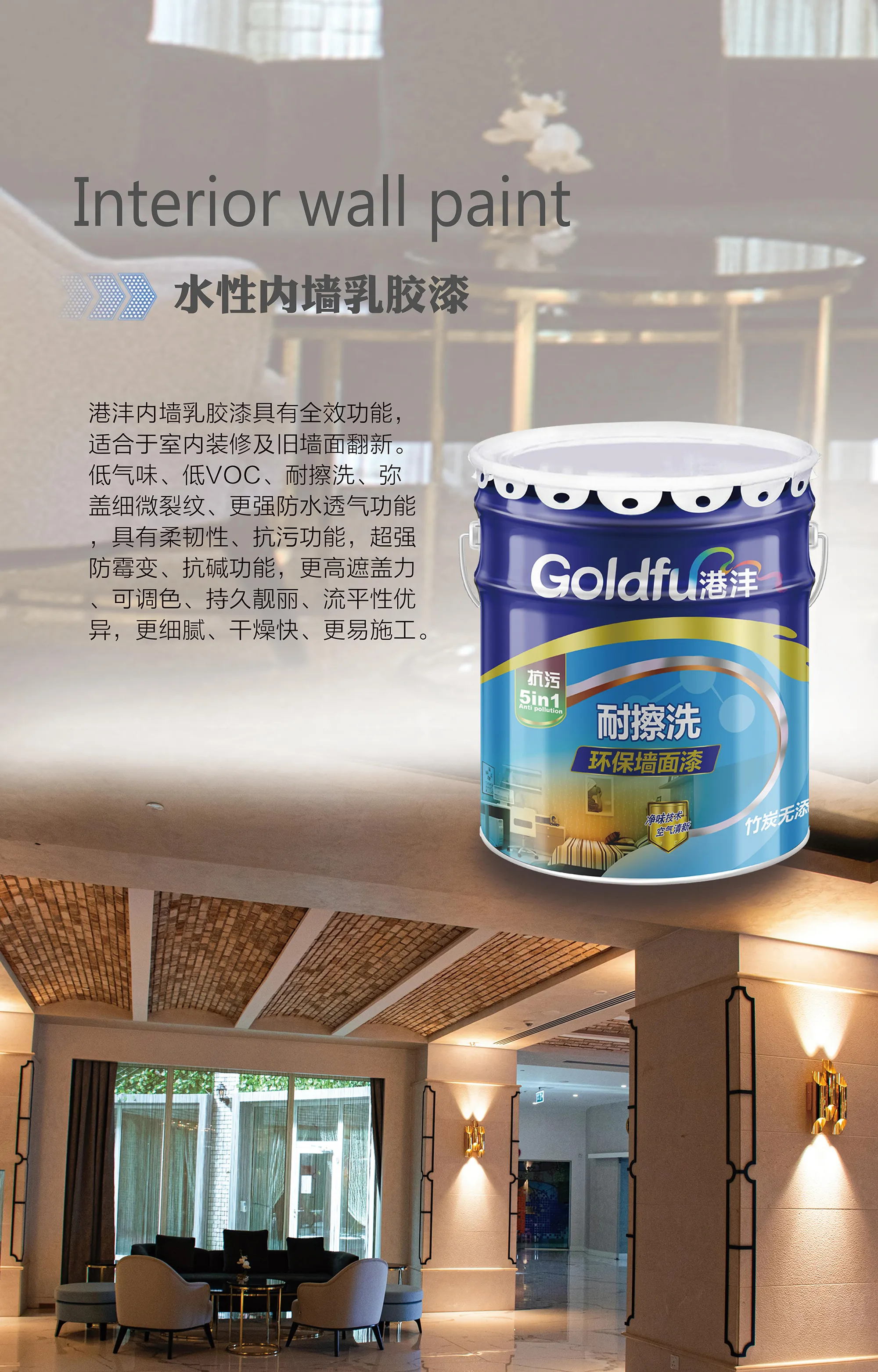 Gangfeng Clean Flavor Wall Paint adopts super penetration technology, forming an excellent elastic paint film with stronger shrinkage, which can effectively prevent and repair cracks. Even if small cracks appear inside the wall, the surface paint film is not affected at all, maintaining the long-lasting beauty of the wall.